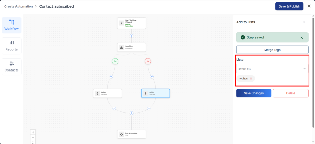 If the email does not contain @bus, the automation will add the contact to the “not bus” list.