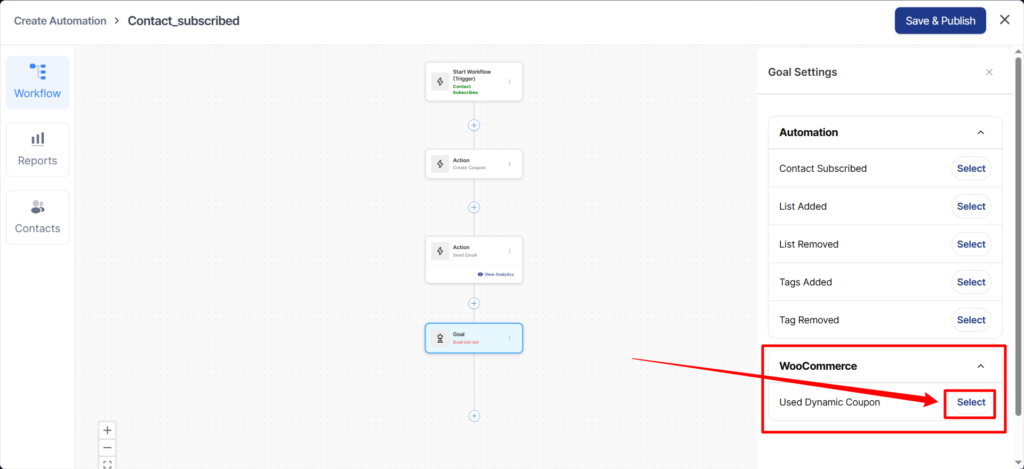 Used Dynamic Coupon—Achieve the goal when a contact uses a dynamic WooCommerce coupon.