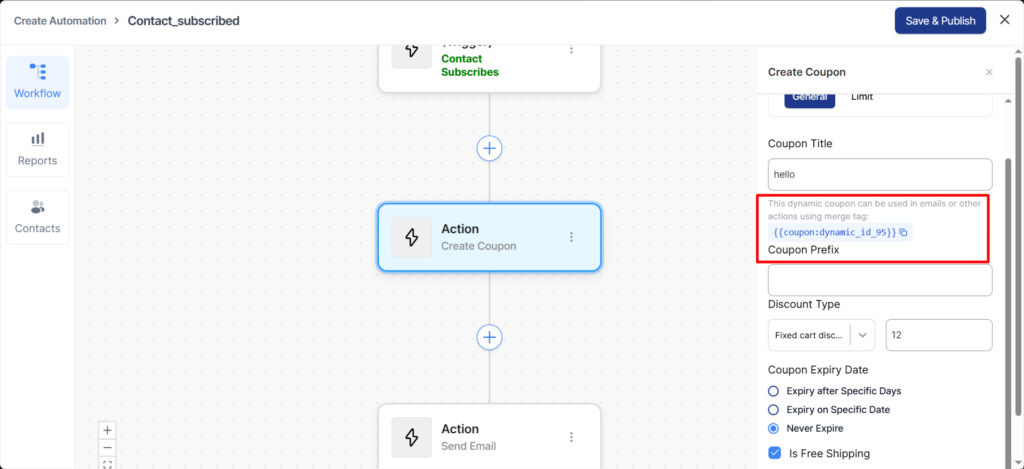 This action creates a coupon, and the available merge tags let you dynamically control the coupon code during automatic creation.