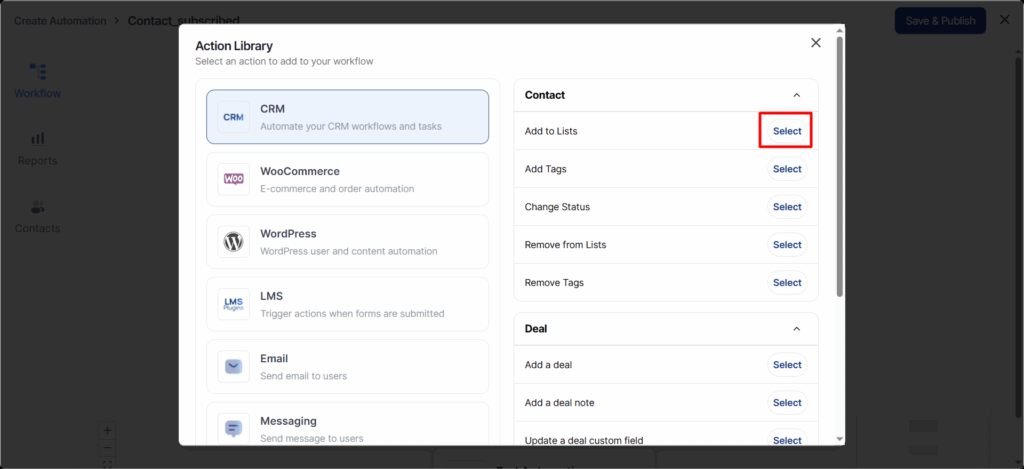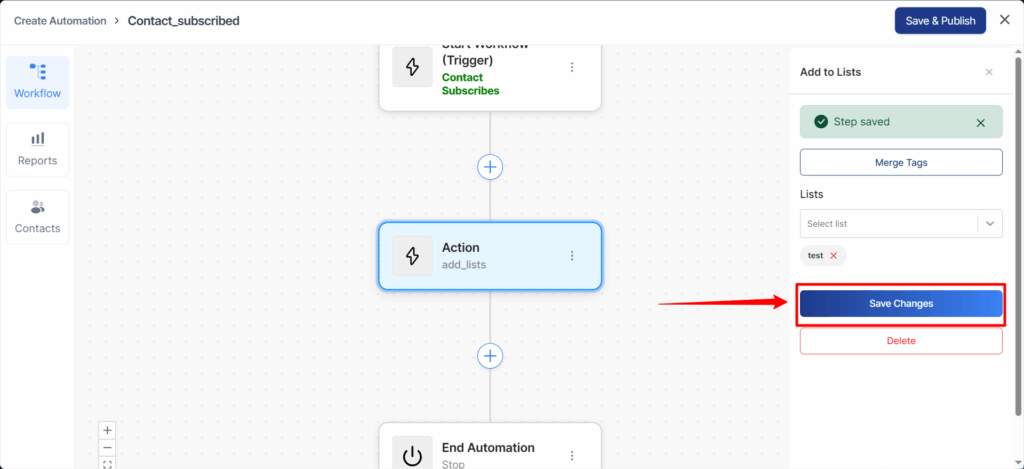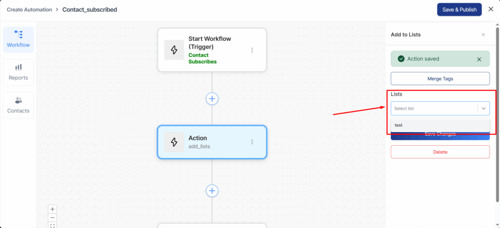 Here we have selected “Add to Lists” as the action.