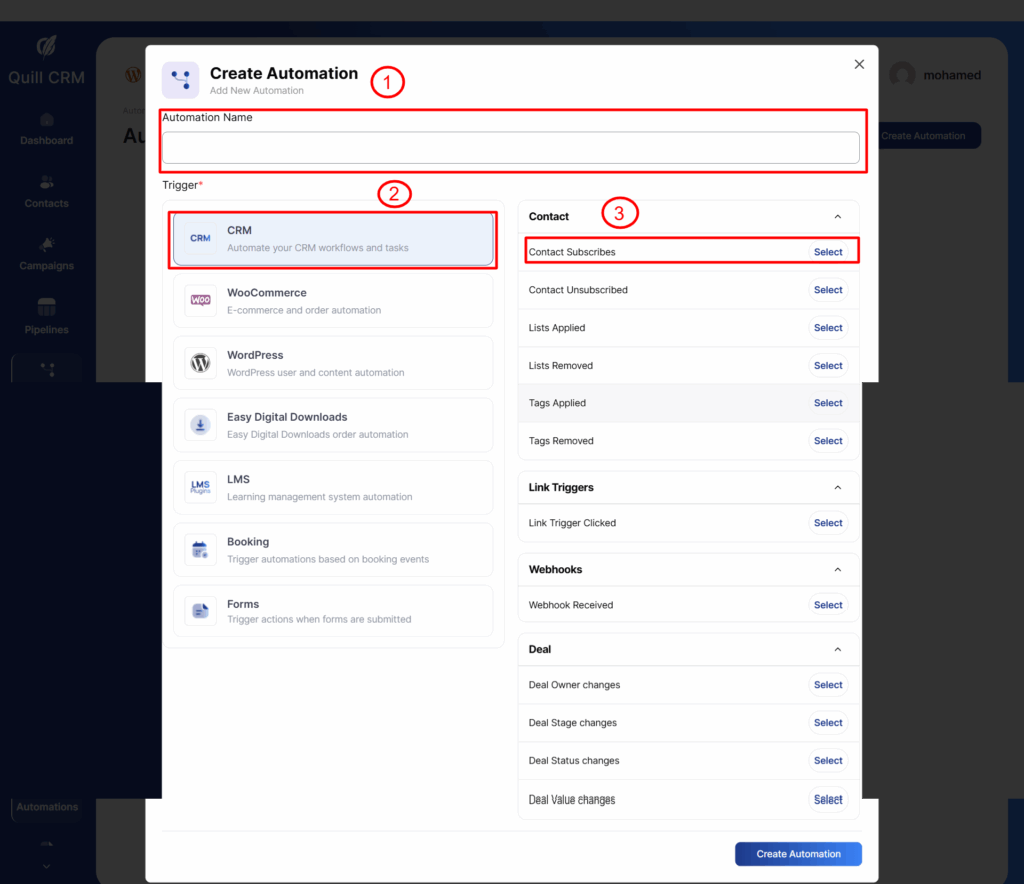 You can always integrate with other WordPress plugins and CRMs to bring in other events and set up automations in QuillCRM Automations.