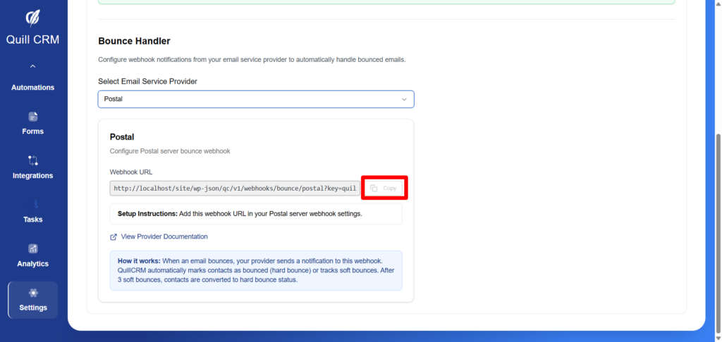 Your webhook URL will look like:> https://yoursite.com/wp-json/qc/v1/webhooks/bounce/postal?key=your_security_key