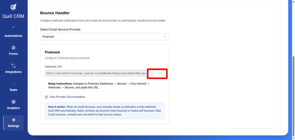 Your webhook URL will look like: https://yoursite.com/wp-json/qc/v1/webhooks/bounce/postmark?key=your_security_key