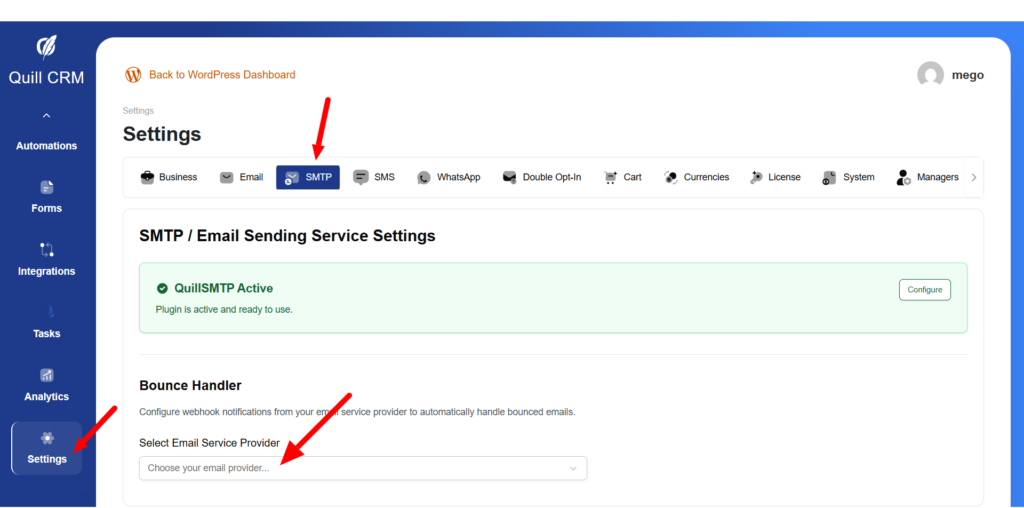 - Go to QuillCRM → Settings → SMTP→ Bounce Handling