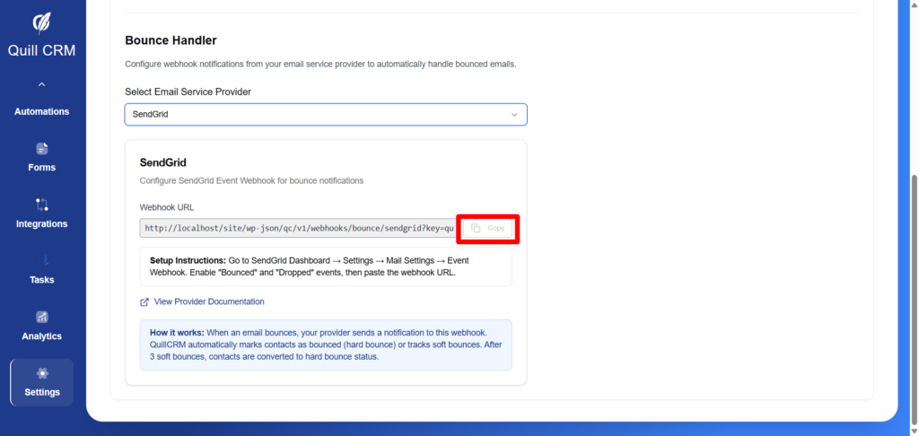 Your webhook URL will look like: https://yoursite.com/wp-json/qc/v1/webhooks/bounce/sendgrid?key=your_security_key