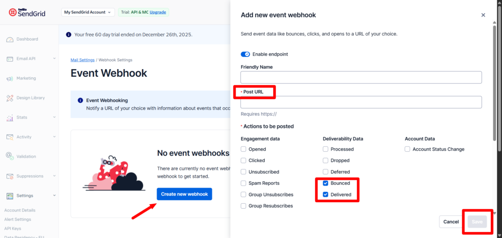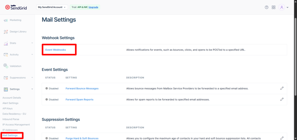 - Settings → Mail Settings → Event Webhook