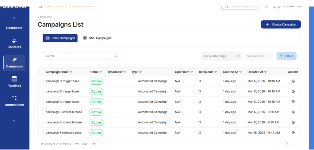 All automated campaigns appear in the Email Campaigns tab alongside standard campaigns. Automated campaigns are identified by the “Automated Campaign” type badge and display an Active or Draft status badge.