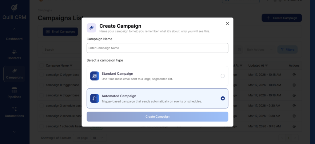 Automated Campaigns in QuillCRM let you send emails automatically based on events (like publishing a new blog post or product) or on a recurring schedule (daily, weekly, or monthly). Unlike standard campaigns that are sent once manually, automated campaigns stay active and fire every time the trigger condition is met.