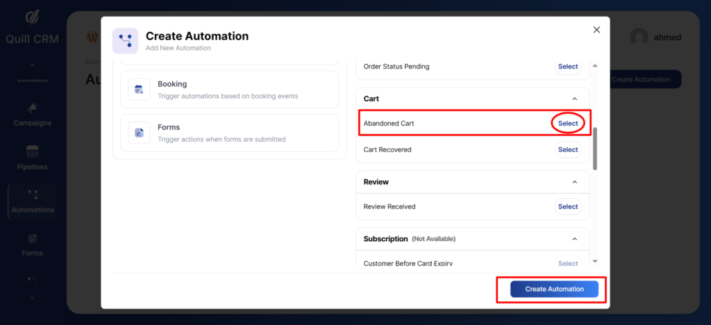 Go to the WooCommerce section and select Abandoned Cart; click on Create Automation.