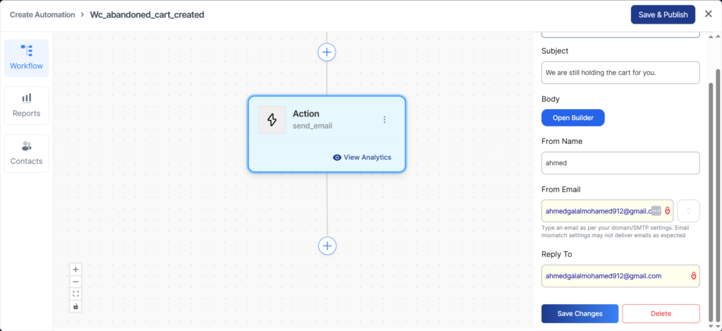 • The automation continuously monitors whether the customer completes their purchase using the cart recovery link or directly on the website. If the order is placed, the automation automatically stops further actions for that particular contact. No additional setup is required to remove them from the automation.