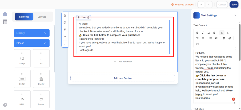 Abandoned Cart Automation is a workflow that automatically follows up with customers who add products to their cart but leave without completing the checkout. It helps recover lost sales by sending timely reminders, offers, or incentives (such as emails or SMS) to encourage customers to return and complete their purchase.