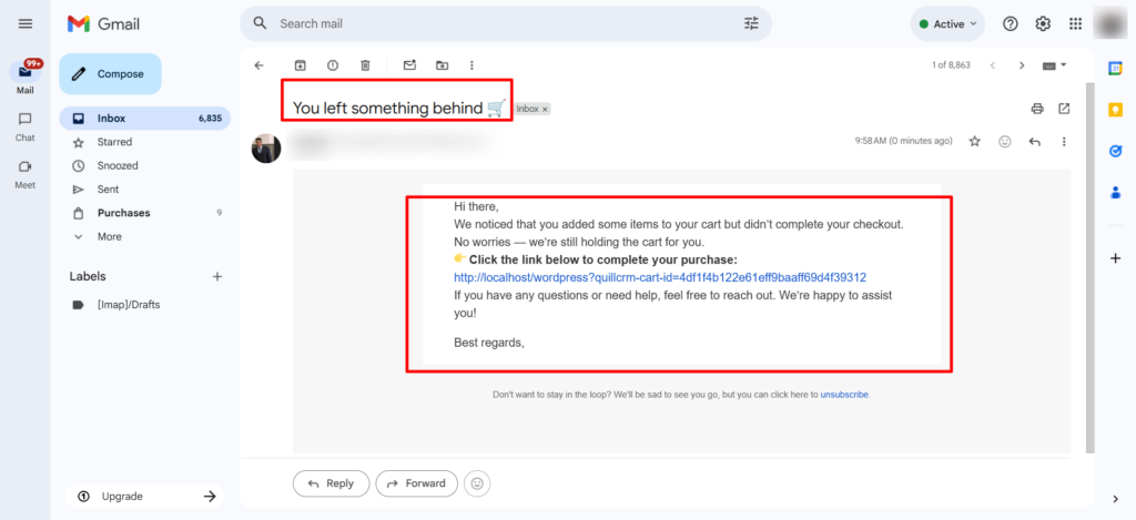 After one hour, an email will be sent to the contact who abandoned the cart.