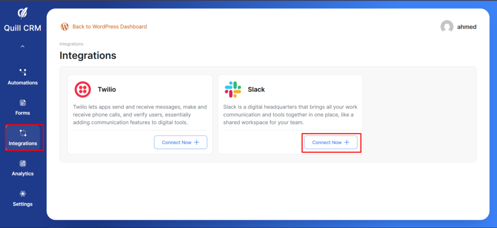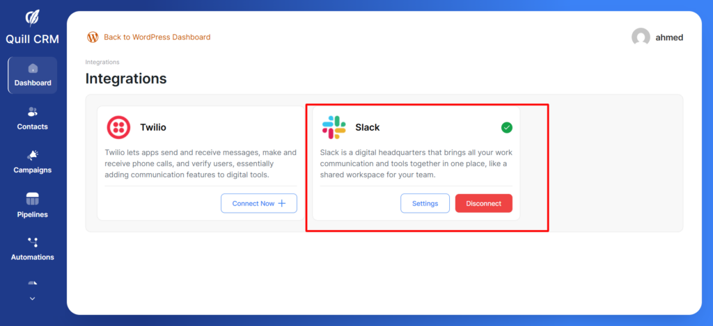 In this documentation, you’ll learn how to sync your Slack account with QuillCRM Automations.