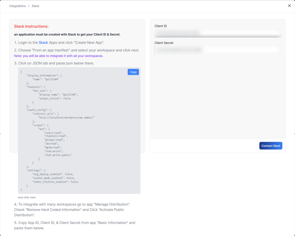 After obtaining the Client ID and Client Secret, click on Connect Slack. If the credentials are correct, the connection will be established; otherwise, the connection will fail.