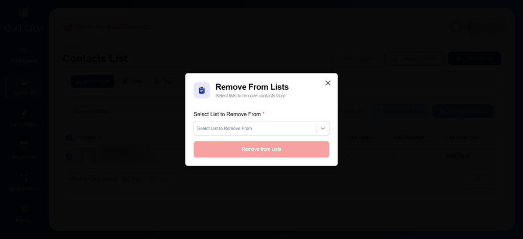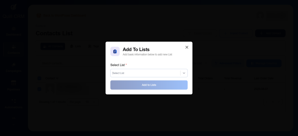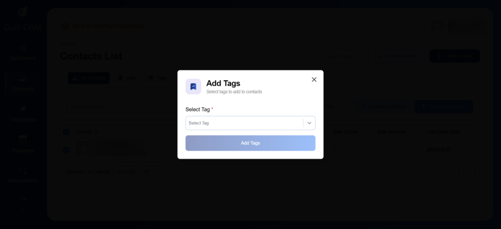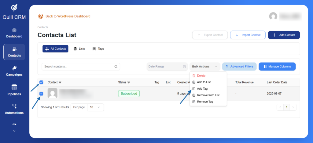 Select multiple contacts using the checkboxes to perform bulk operations. The Bulk Actions dropdown appears when you select one or more contacts.