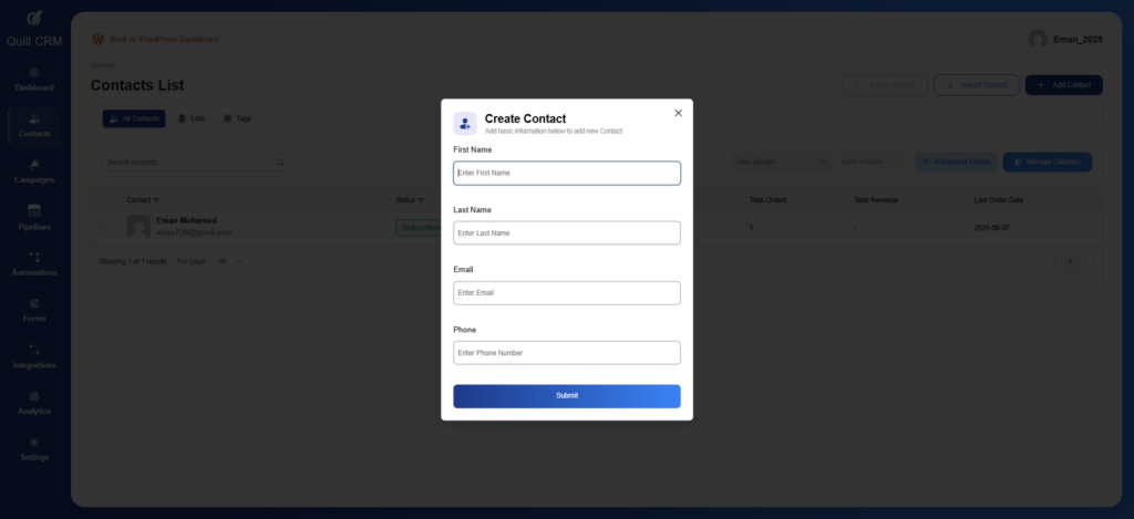 Step 1: Navigate to Contacts Go to QuillCRM → Contacts in your WordPress admin Click the Add Contact button Step 2: Fill the Required Data First Name Last Name Email Phone Click the Submit button