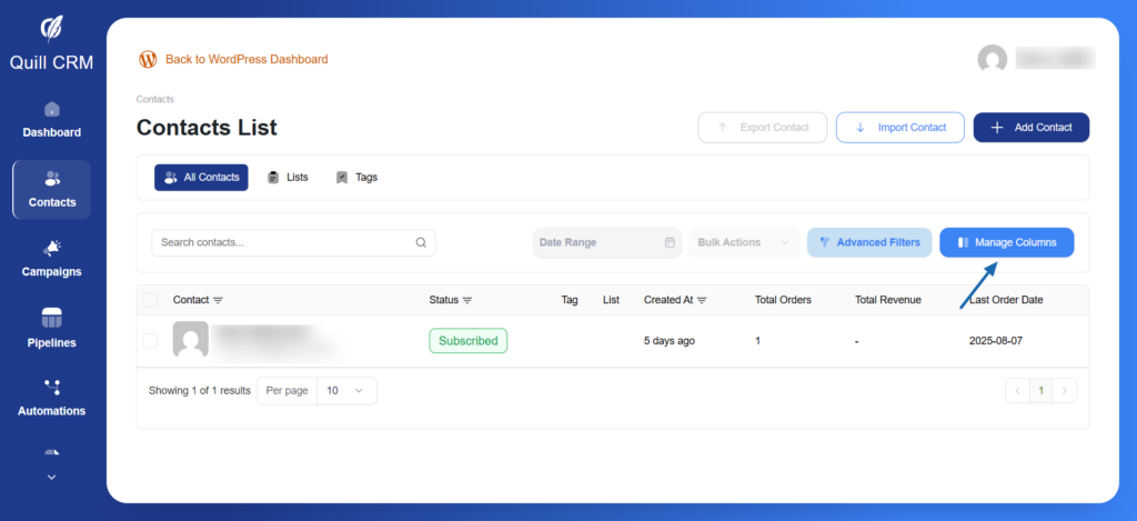 Customize your dashboard view by selecting which data fields appear as columns in the contacts table.