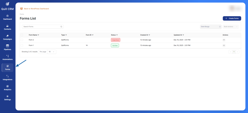 - Navigate to the Forms section from the left sidebar