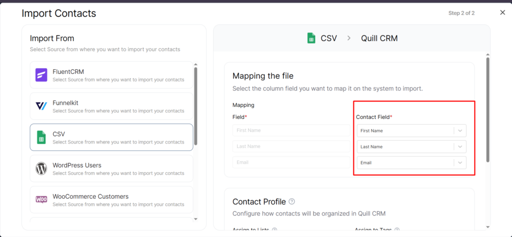 This is the most important step. You need to tell Quill CRM which CSV columns correspond to which contact fields.