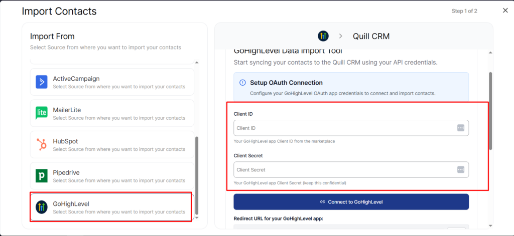 Quill CRM supports importing contacts from GoHighLevel (GHL) using OAuth authentication. This allows you to migrate your GHL contacts into Quill CRM with their associated tags and status.
