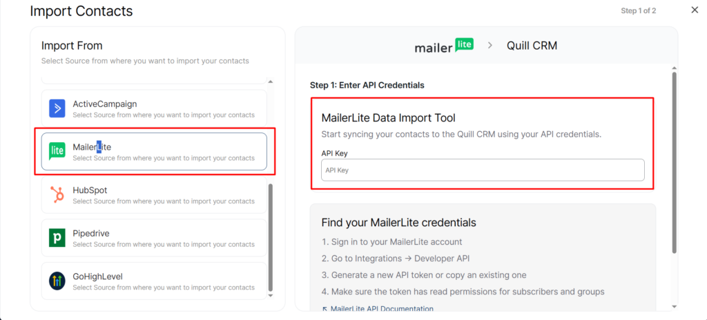 - Field mapping works similar to CSV import — you manually map each MailerLite field to a Quill CRM field.