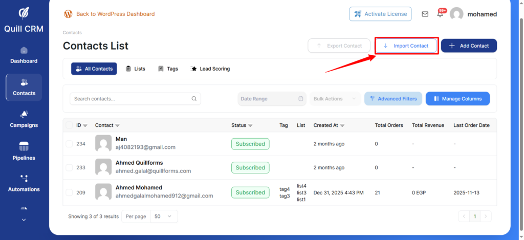If you are using MemberPress on your WordPress site, Quill CRM can import all your MemberPress members directly — including their first name, last name, email, and membership levels. No API keys are needed since MemberPress runs on the same WordPress installation.
