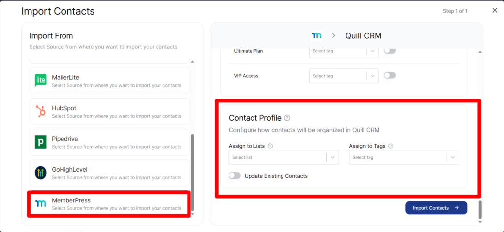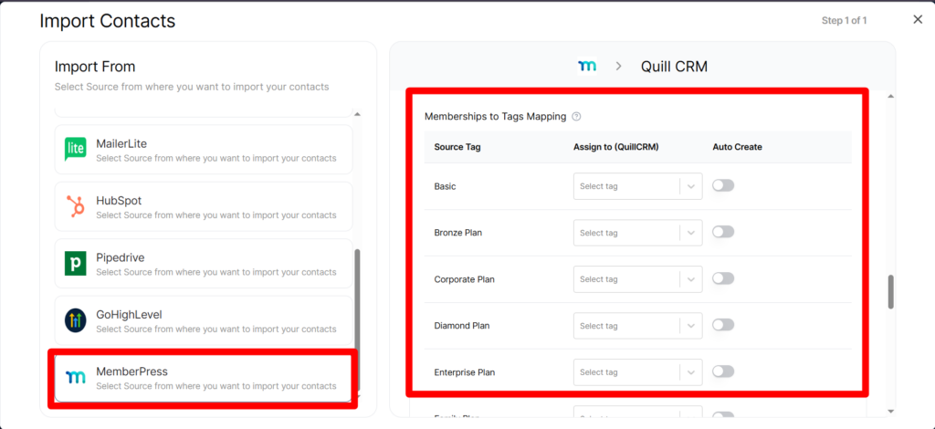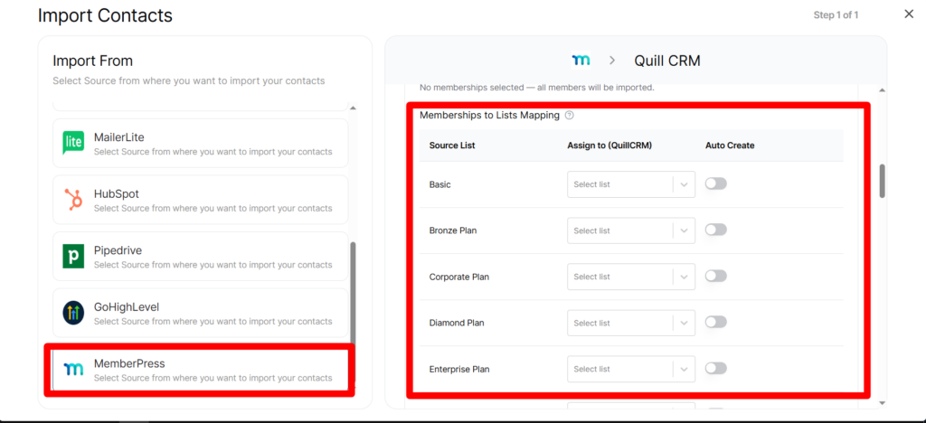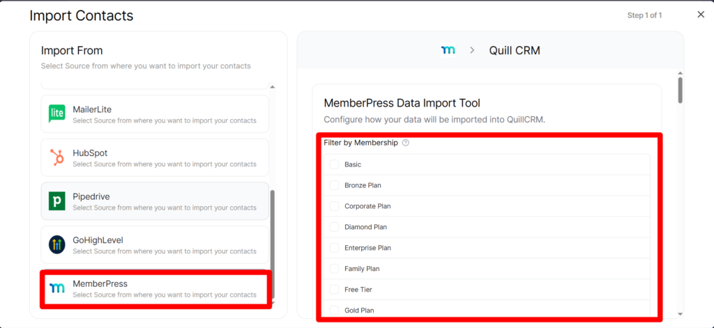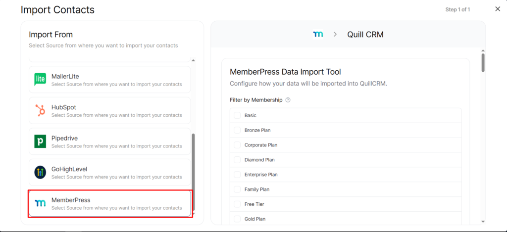 - Select “MemberPress” from the source list. Quill CRM will automatically connect to your MemberPress database and load your membership levels.