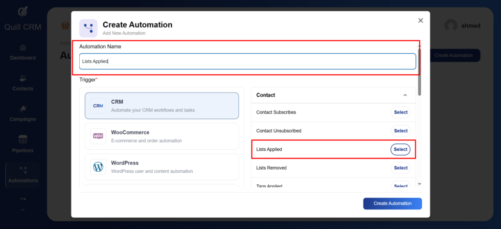 In this example, I will create a trigger called “List Applied.”