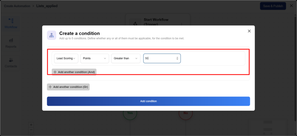 When a list is added to a specific contact, the automation will check whether the contact’s lead score is greater than 50.