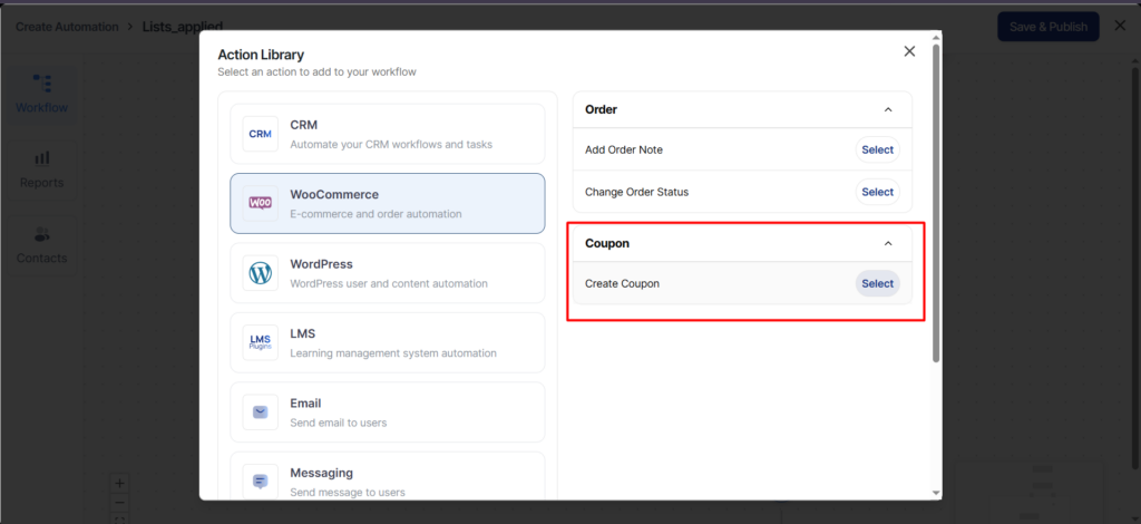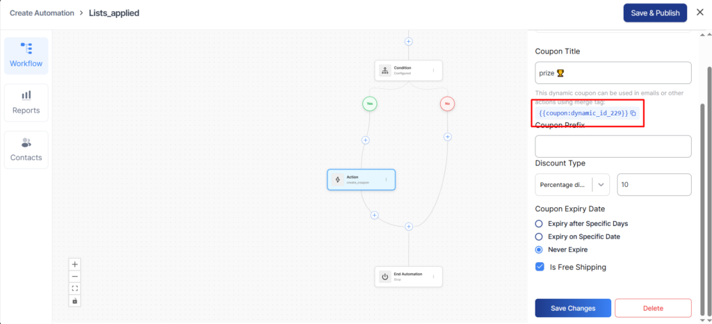 5. Configure the settings for the Create Coupon action. Click the icon to copy the coupon’s dynamic name.