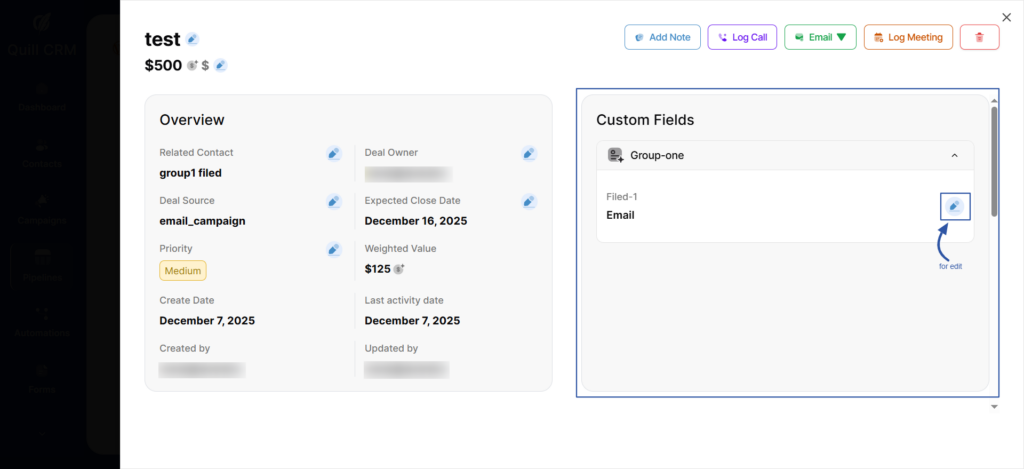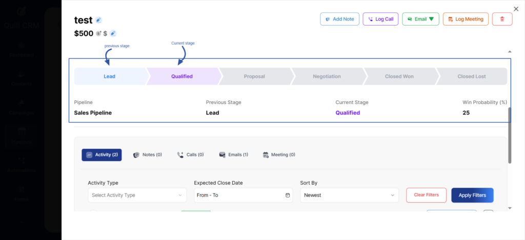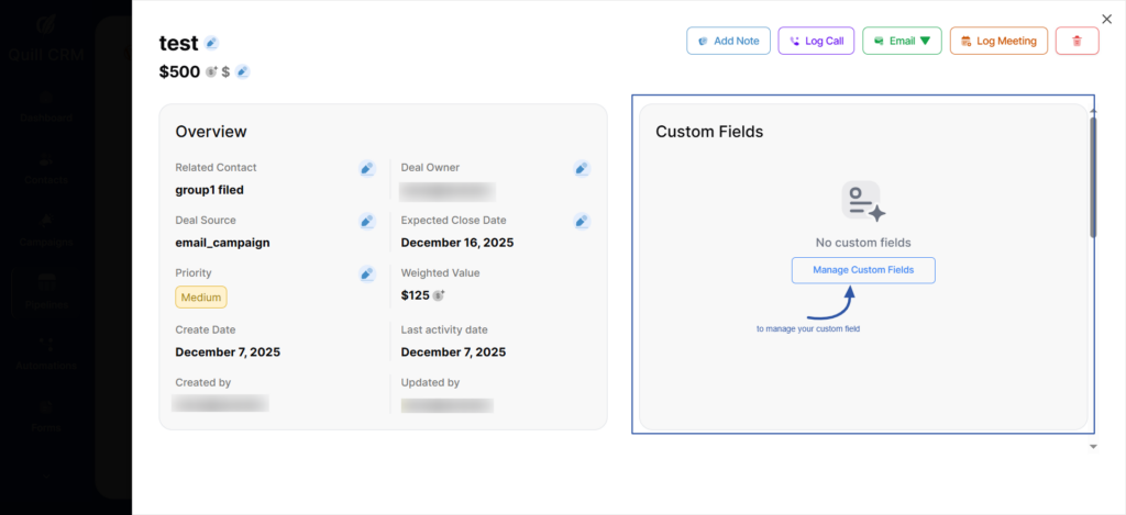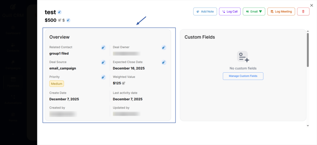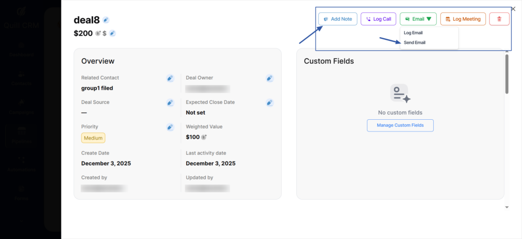 At the top of the page, you will find the Activity Actions section, where you can quickly add notes, log calls, log meetings, or any action related to this deal.