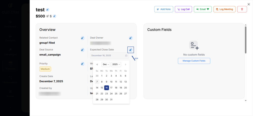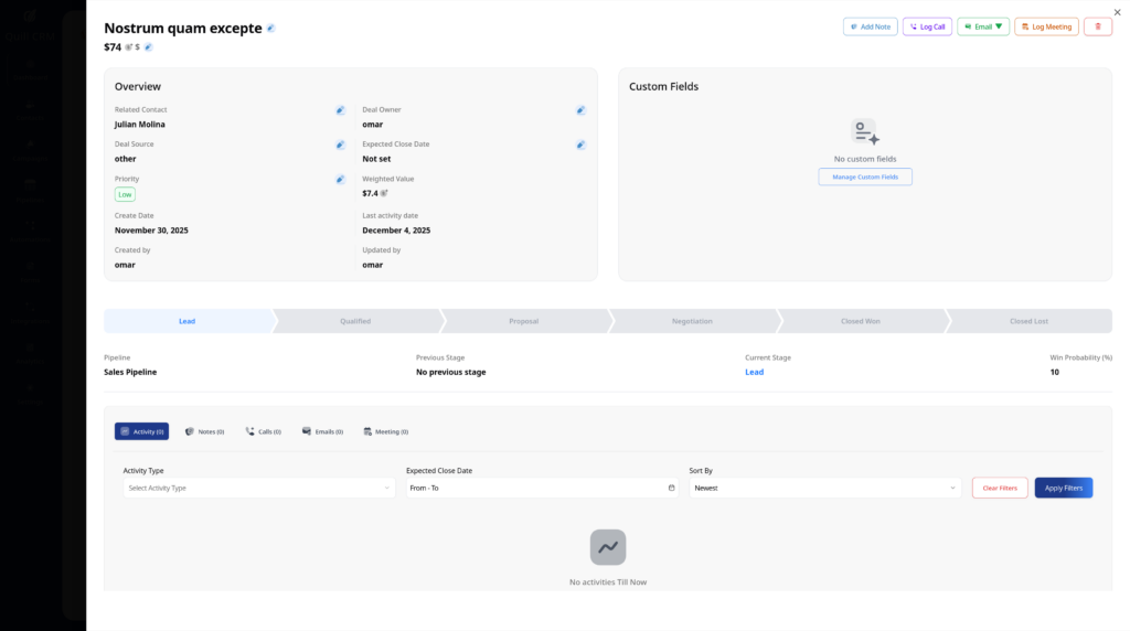 From here, you can track progress, update and view custom fields, add activities, and review recent activities taken on this deal
