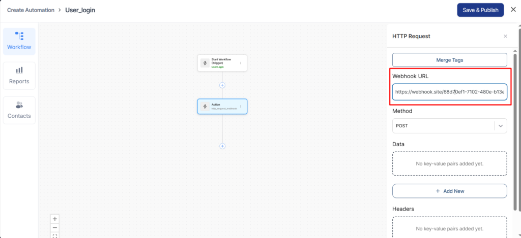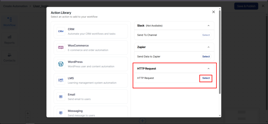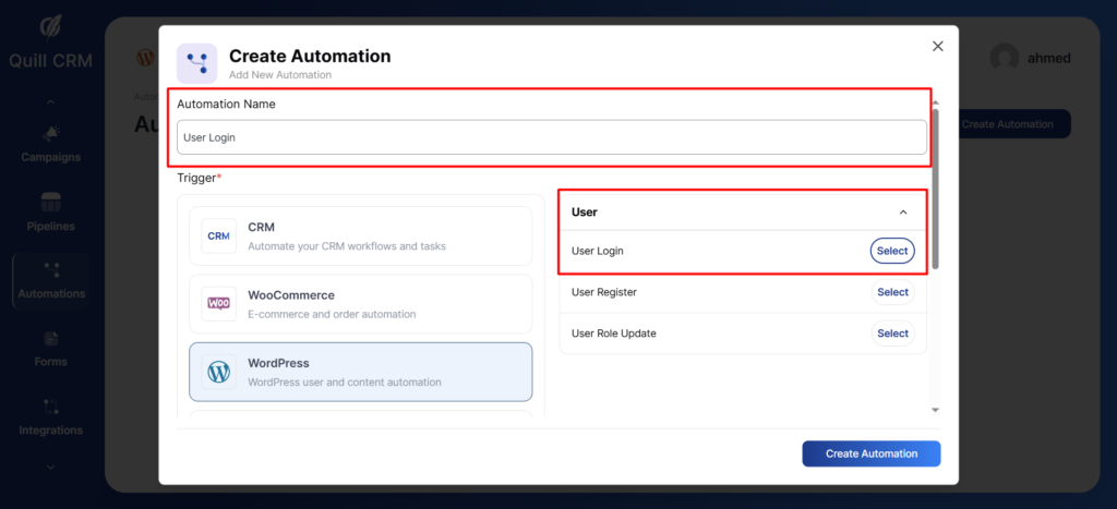 Here, we will be pushing the data every time a user gets logged in. For this, we will create the automation with QuillCRM Automations.