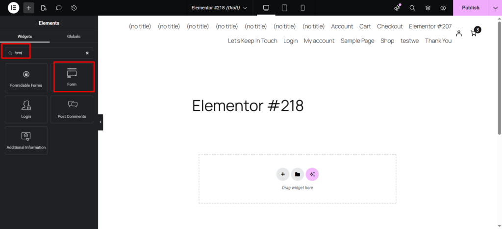 Search “Form” in the widget search box of Elementor and then drag & drop the widget on the screen.