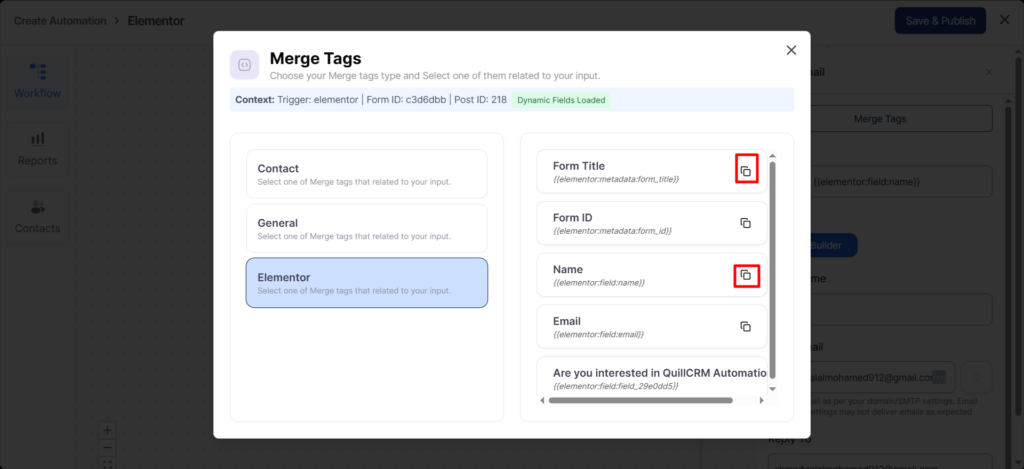 To fetch any field of your form, click on the copy icon next to the form field merge tag.