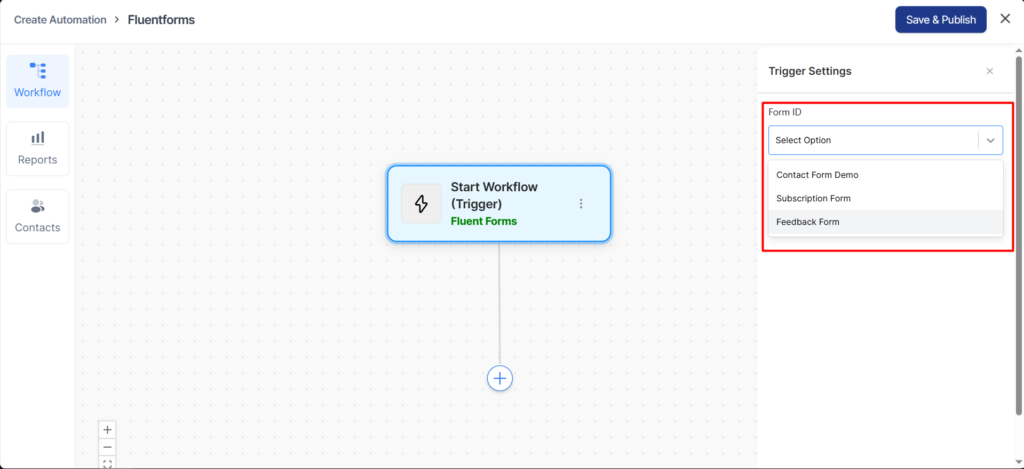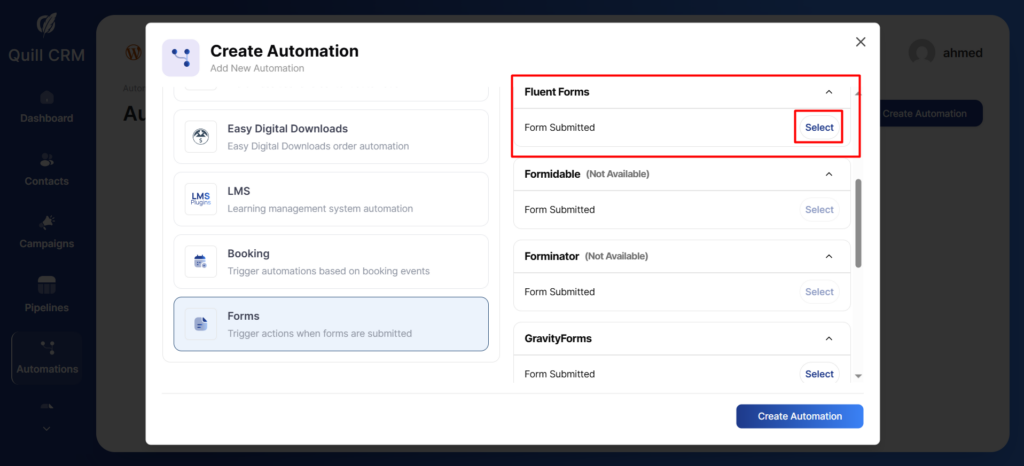 After that, go to the Automation tab and select the Fluent Forms trigger.