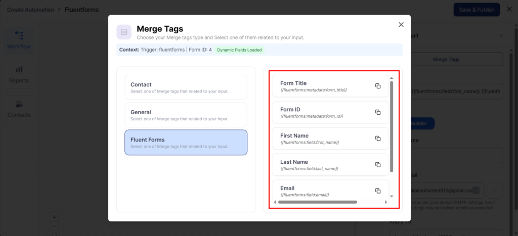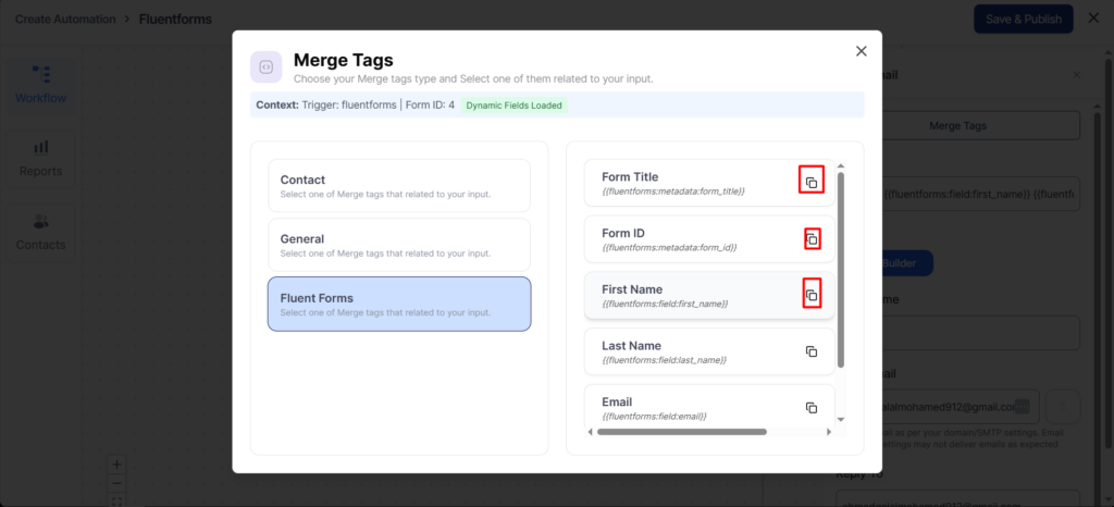 To fetch any field of your form, click on the copy icon next to the form field merge tag.