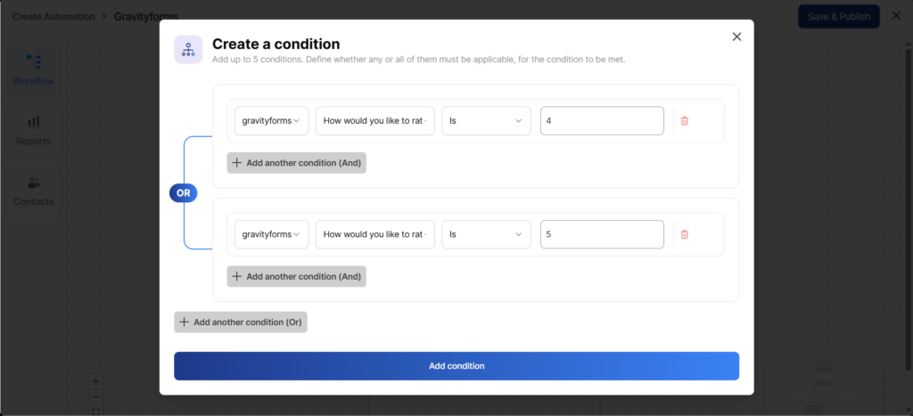 Since in this example we’ll be taking 2 rating values, ‘4’ and ‘5’, hit the ‘Add another condition’ to create 2 conditions—one for rating = ‘4’ and the other for rating = ‘5’.