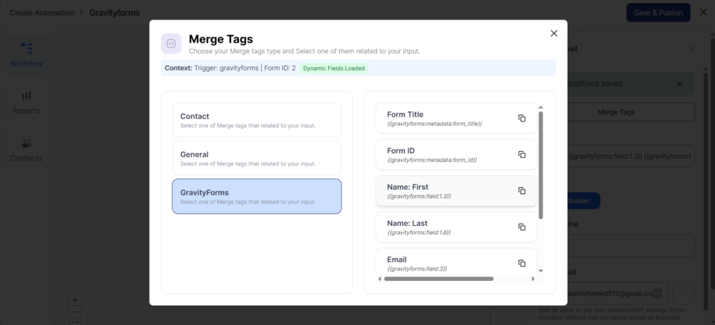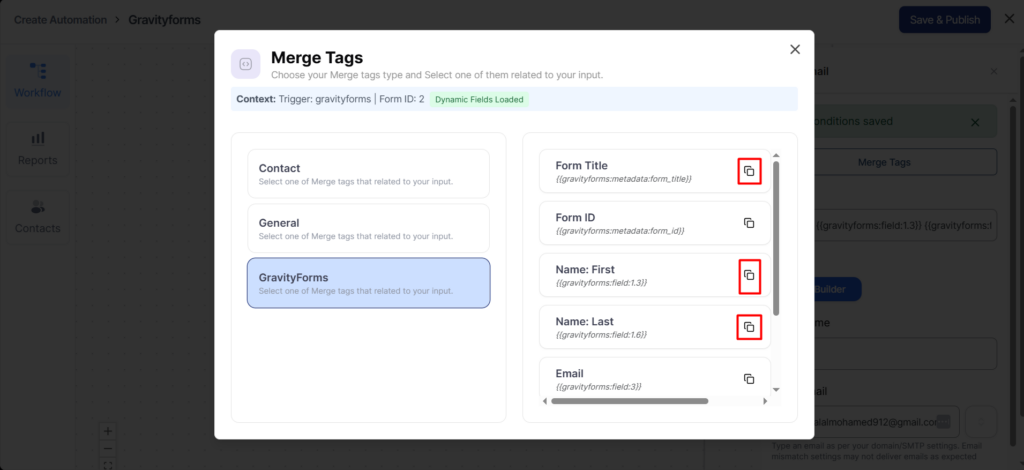 To fetch any field of your form, click on the copy icon next to the form field merge tag.