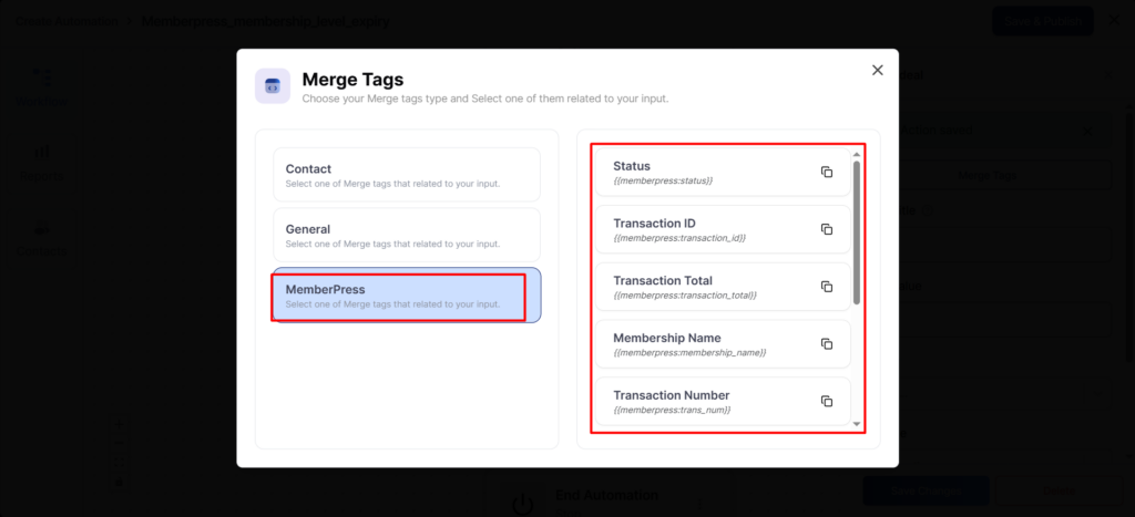 Merge tags let you dynamically insert MemberPress data into emails, SMS messages, and other automation content. The following merge tags are available when a MemberPress trigger is used: