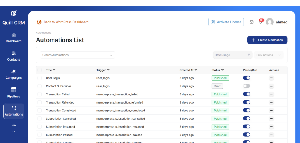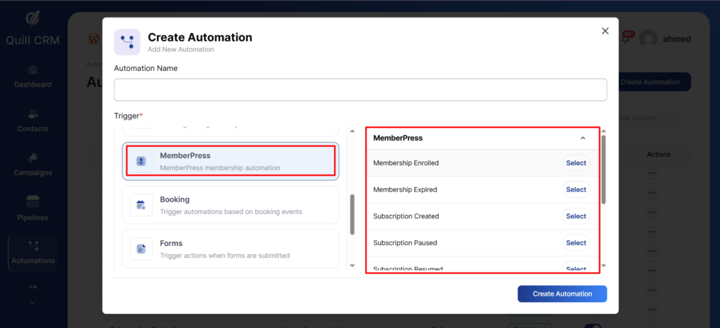Quill CRM integrates deeply with MemberPress, the popular WordPress membership plugin. This integration allows you to automate your membership workflows — from welcoming new members to handling cancellations and renewals — all within Quill CRM’s visual automation builder.