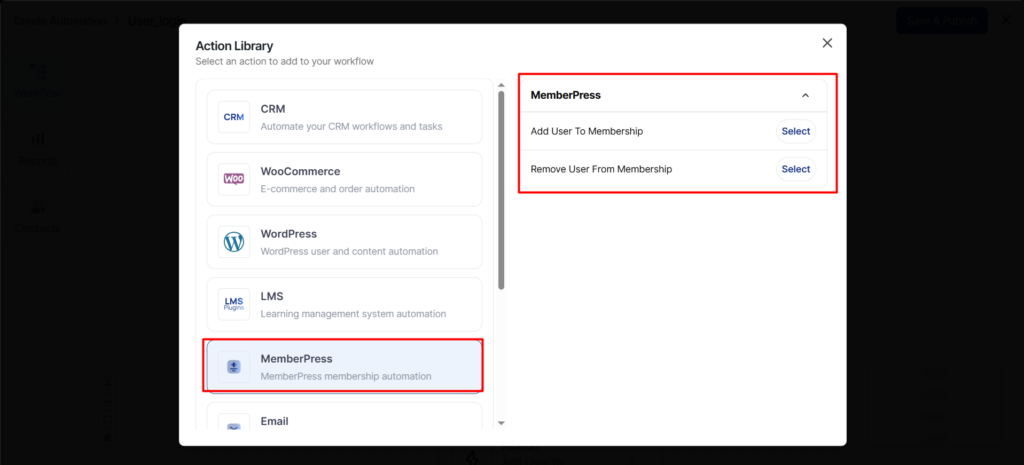 Actions are steps that Quill CRM executes within an automation workflow. MemberPress provides two membership management actions.