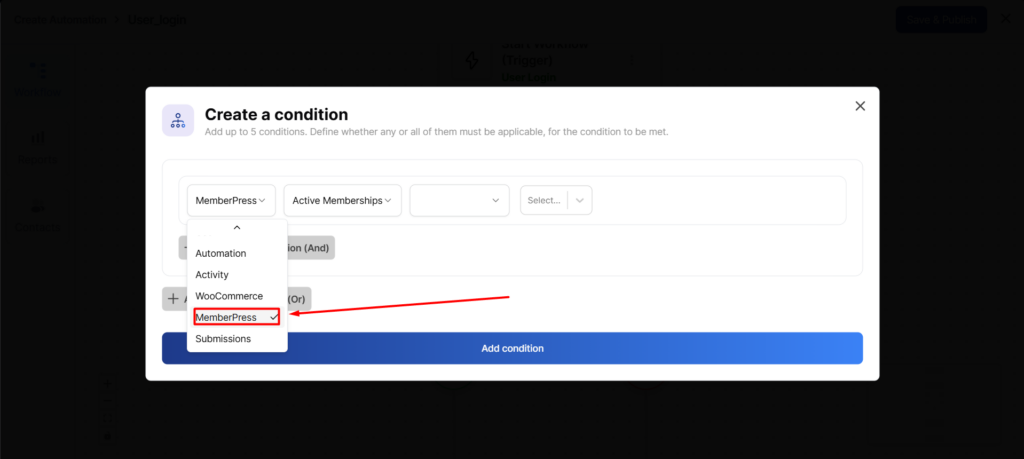 Rules allow you to add conditional logic to your automations, so workflows only proceed when certain criteria are met. MemberPress provides five rules grouped under the MemberPress section in the conditions panel.