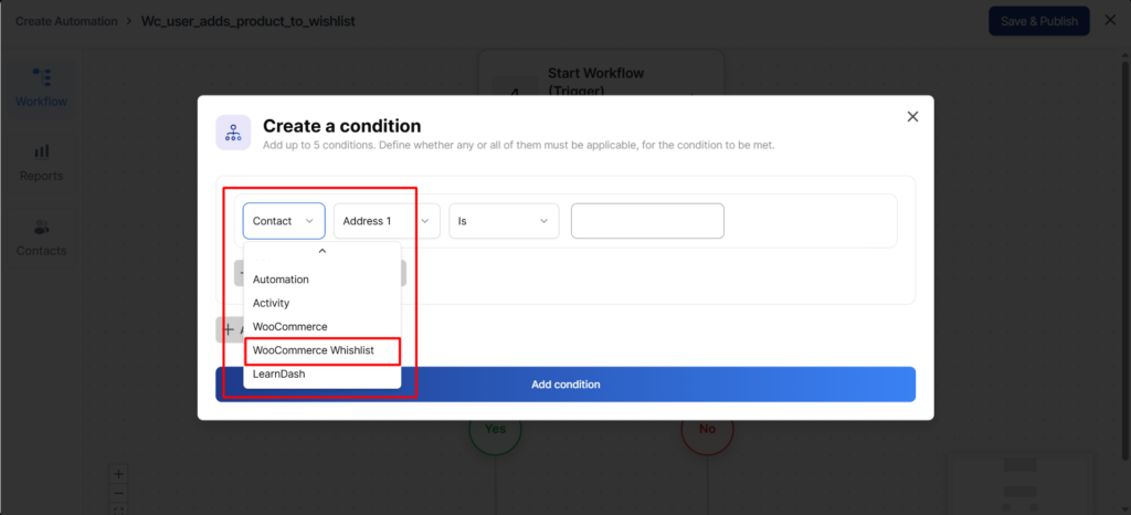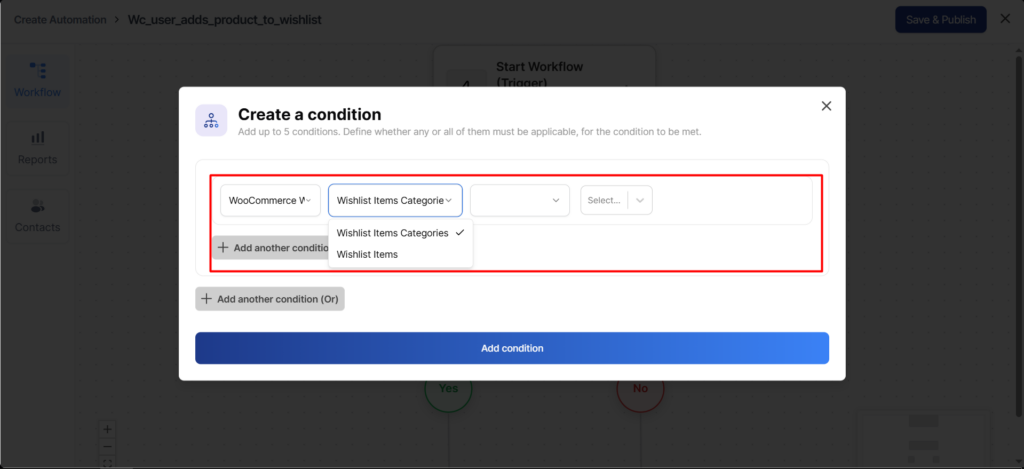 Click on Add New Condition and select Wishlist when setting up conditions.
