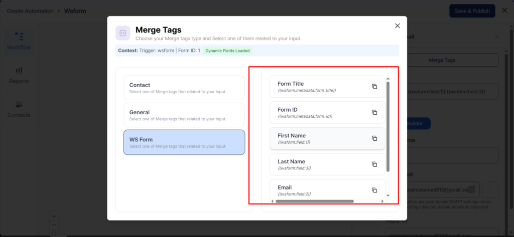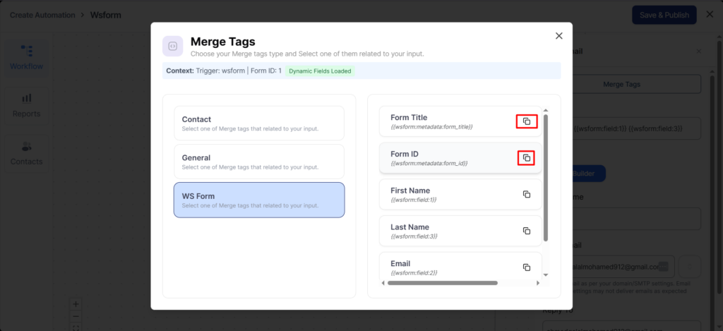 To fetch any field of your form, click on the copy icon next to the form field merge tag.